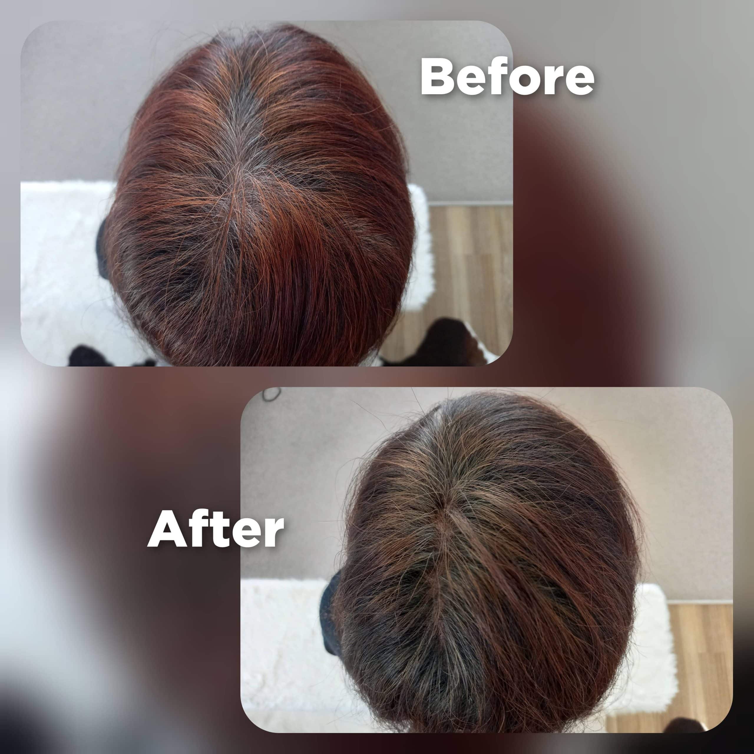 Made with 100% natural henna, hibiscus (vitamin C-rich for reddish tone), and bhringraj (supports darker hair and scalp rejuvenation) and aloe vera. This step turns gray hair a vivid orange, preparing it for deeper color.